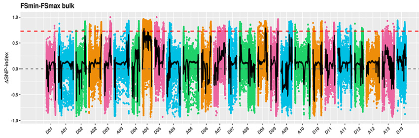 基于比對分析發(fā)現(xiàn)的SNP、InDel標(biāo)記,進行子代SNP、InDel頻率差異分析,然后進行目標(biāo)性狀區(qū)域定位,最后進行候選基因提取和功能注釋。