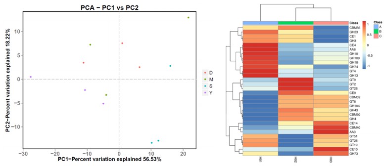 篩選與樣品分組顯著相關因子(基因、功能);基于篩選因子對樣品進行主成分分析(PCA);基于篩選因子對樣品進行  聚類分析。